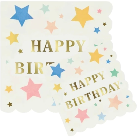 Você é uma estrela! Guardanapos de papel decorativos com estrelas coloridas e inscrição "Happy Birthday" em dourado, da marca Meri Meri, para festas de aniversário. Comemore o aniversário de alguém especial com estes lindos guardanapos de papel festivos. Nosso guardanapo "Happy Birthday" apresenta estrelas coloridas combinadas com dourado brilhante, perfeitos para complementar qualquer tema de festa de aniversário. Feitos em papel de 3 camadas, práticos e decorativos. Borda vermelha recortada.
