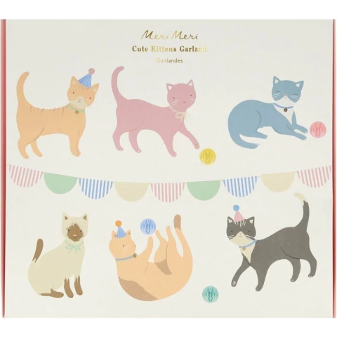 Esta linda guirlanda é uma maneira fácil e instantânea de adicionar fofura à sua mesa ou parede de festa. É ideal para crianças que adoram gatinhos, ou porque não dar uma festa para o seu felino preferido? Também faz uma decoração marcante no quarto depois da festa. Apresenta 6 gatinhos, 5 bolas de favo de mel de papel de seda e uma guirlanda recortada com 12 flâmulas, detalhes do pompom, detalhes em fita de veludo creme e menta, fio metálico dourado e fita de algodão natural. É necessária alguma automontagem simples, contém fita dupla face. Embalagem feita com papel mix FSC.
