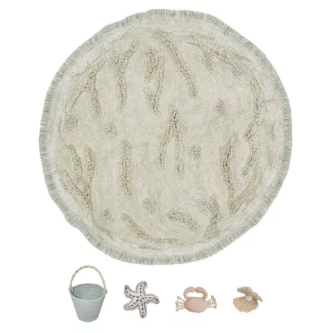 Combinando pêlos curtos e médios num padrão irregular, o tapete Island evoca as dunas suaves de uma praia arenosa. Envolto por franjas curtas na cor natural e azul sálvia representando a orla marítima, o tapete vem com um conjunto de acessórios para brincar: uma cesta trançada de cordão azul sálvia, um caranguejo macio, uma estrela do mar bordada à mão e duas conchas com pérolas. Certificações: European standard on Safety of toys EN71-1, EN71-2, EN71-3, REACH, ASTM F963-17, Standard Consumer Safety Specification on Toy Safety, CPSC 16 CFR, CPSIA lead